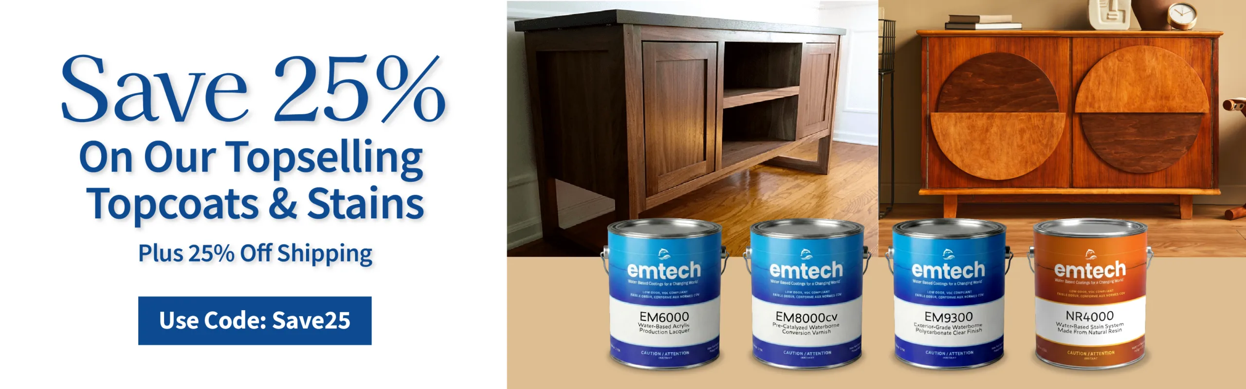 Our flagship brand, EMTECH® water-based wood finish, provides a range of ultra-low VOC coatings including our top-selling EM6000 Water-based Acrylic Production Lacquer as well as water-based polyurethane, urethane, conversion varnish, pigmented top coats, sealers, primers, grain fillers and wood stains. Plus, the Target Coatings lab can custom tint EM6500 Bright White Pastel WB Lacquer to custom match any color.
